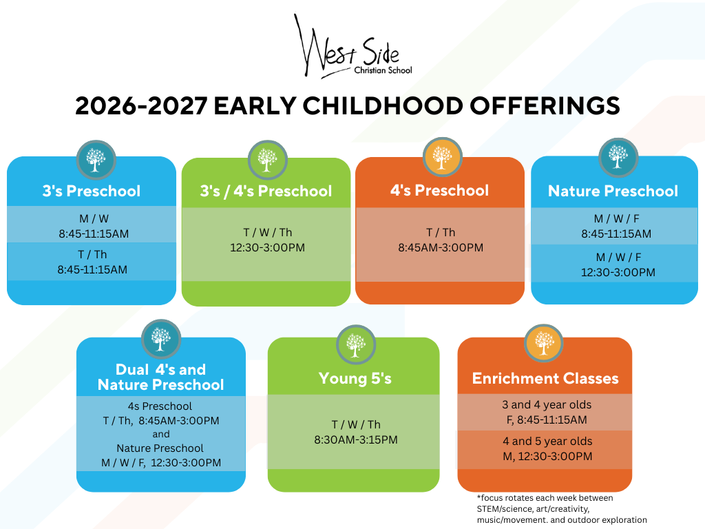 Worship, learning, community, and creation form the foundation of faith-based instruction at WSCS. Our early childhood classes are designed to help your child work cooperatively with classmates, get acclimated to classroom routines, and develop the foundations for school success. Most importantly, we focus on learning about how much God loves them and how they can share God’s love with others through daily Bible stories, worship, and prayer.